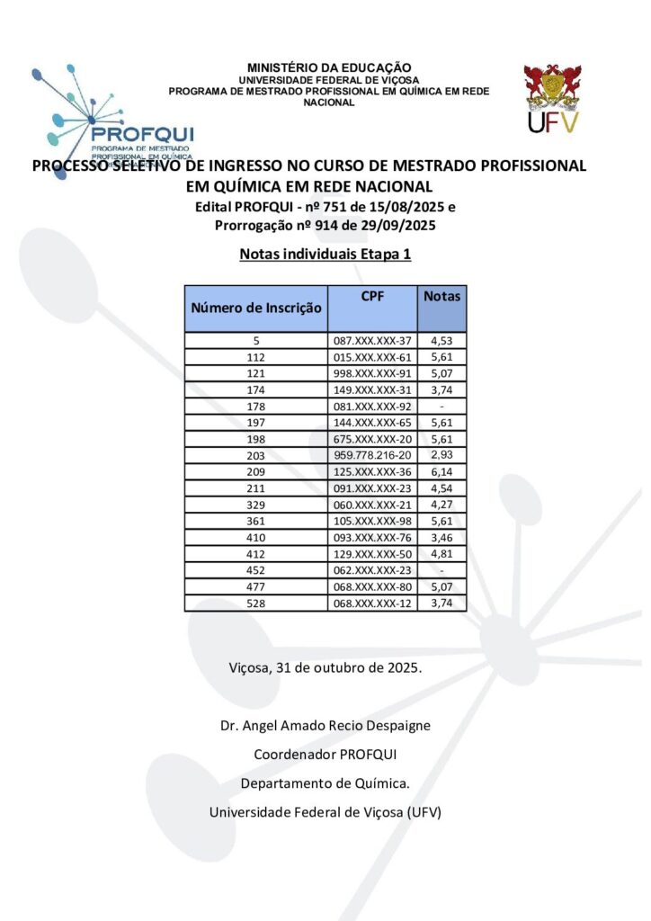 PROCESSO SELETIVO DE INGRESSO NO CURSO DE MESTRADO PROFISSIONAL – Notas individuais Etapa 1